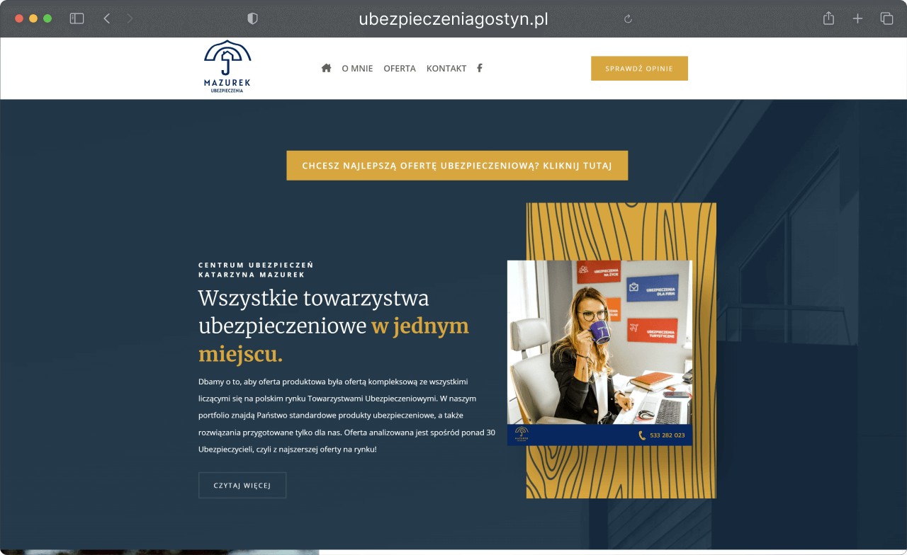 Jasna i przejrzysta strona oparta na szablonie, klarownie prezentująca ofertę ubezpieczeń i dostępne rozwiązania.